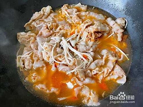 肥牛金针菇下入汤底同煮:煮一两分钟吸点汤味即可出锅,不要太久。