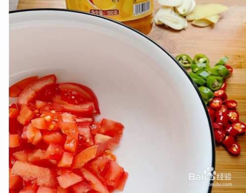 辅料备齐:番茄切成小丁,青线椒和小米椒切圈,姜蒜切片,辣椒酱是灵魂。