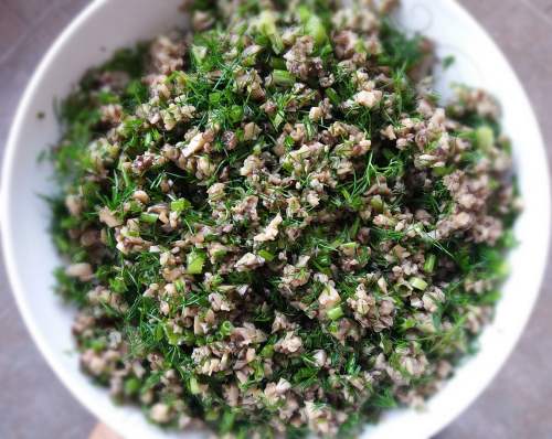 5把茴香菜和菇混合搅拌均匀,馅料就做好了。
