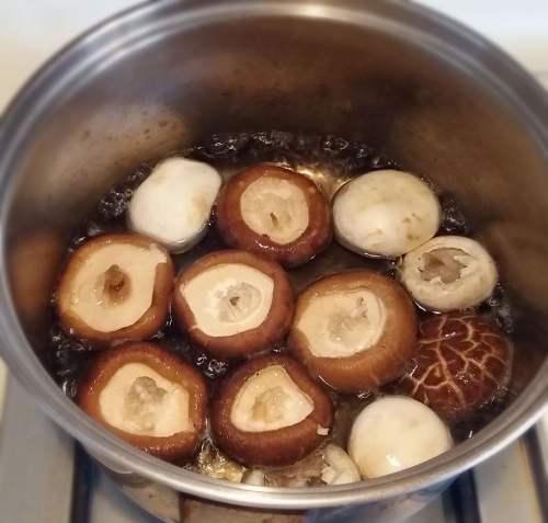 1香菇和白蘑菇去蒂洗净,放入沸水中,焯水30秒捞出。