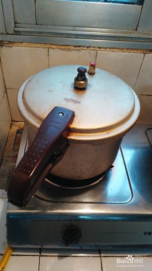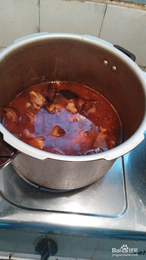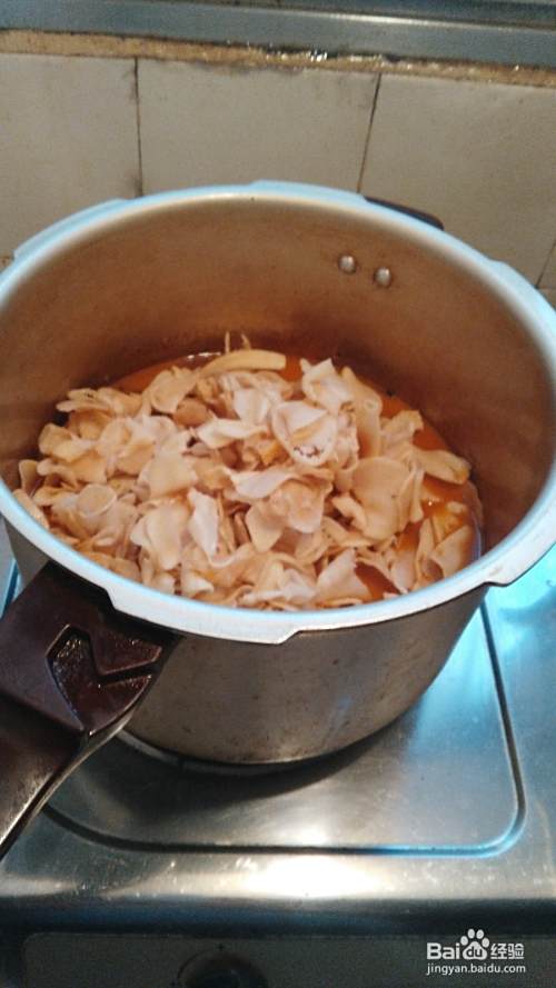 炒一会后,将猪蹄装进高压锅中,加入适量水;