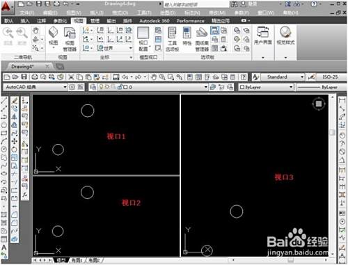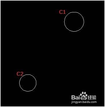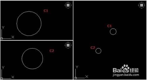 鼠标左键点击视口1,按住鼠标滚轮,平移图形使C1圆显示在视口1的中心,滚动鼠标滚轮,在视口1里面只显示C1圆,并放大C1圆的显示;鼠标左键点击视口2,按住鼠标滚轮,平移图形使C2圆显示在视口2的中心,滚动鼠标滚轮,在视口2里面只显示C2圆,并放大C2圆的显示;鼠标左键点击视口3,按住鼠标滚轮,使两个圆平移到视口3的中心区域。操作完成如下图所示: