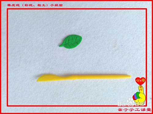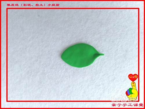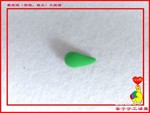 取绿色彩泥适量,滚搓成“水滴”形状。