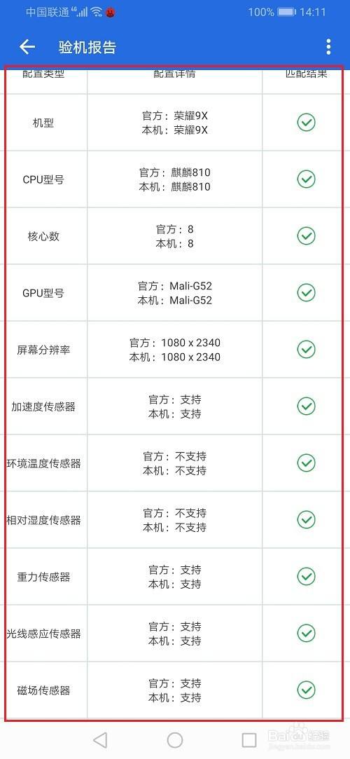 第五步我们下滑界面,可以看到华为手机的各个硬件和官方的硬件一致,可以看到是真机,如果不一致就会显示假机