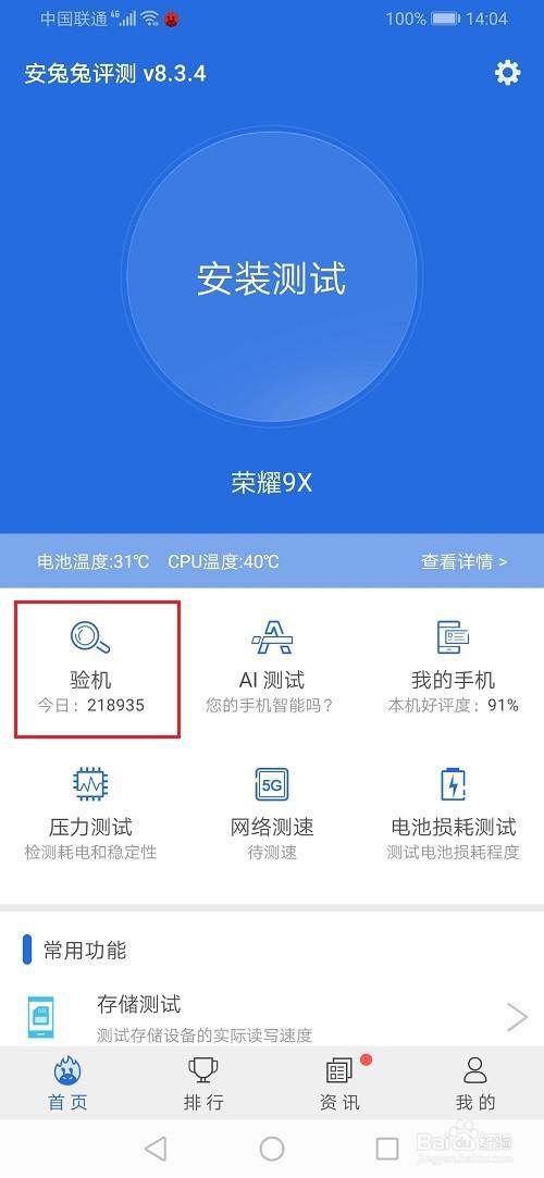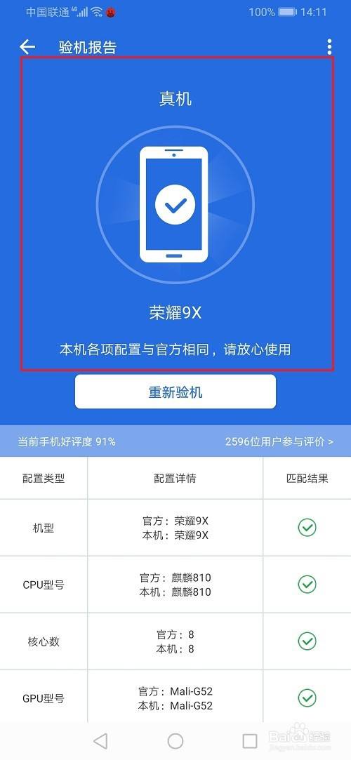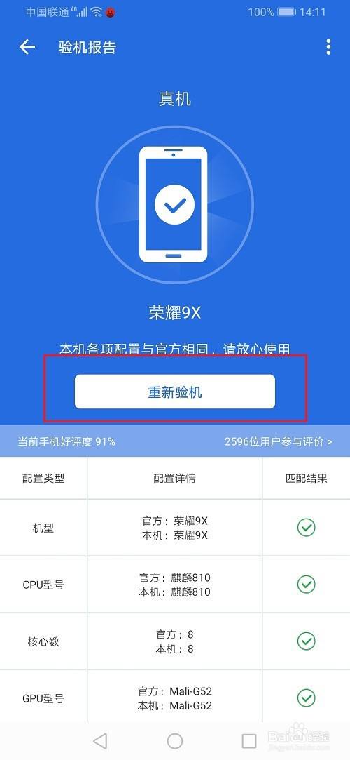 第三步进去应用验机界面之后,点击验机,进行验证是否为真机,会检查华为手机的各个硬件是否和官方的一致