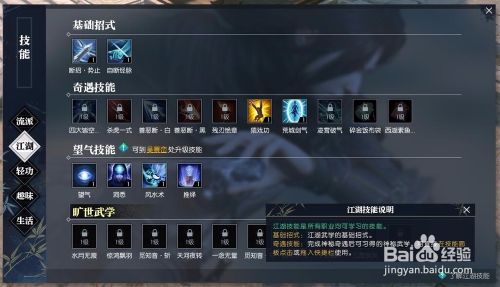升级完技能后,我们在打开我们的角色技能页面,就可以看到我们的修为提升了。当然了除了角色战斗技能外,还有江湖技能,这个技能目前是升级不了的,还有生活技能和轻功技能,点击面板下方的NPC去升级就可以了。