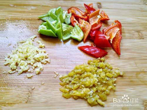 准备两个红辣椒、一个青椒,一块生姜,六个泡椒洗干净备用。将辣椒切块,泡椒和生姜剁碎备用。