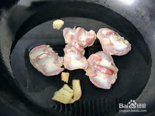在锅里先放入凉水,再把鸡胗放入进去,放入一块拍碎的生姜和少许料酒,大火煮五分钟,捞出。