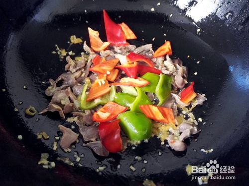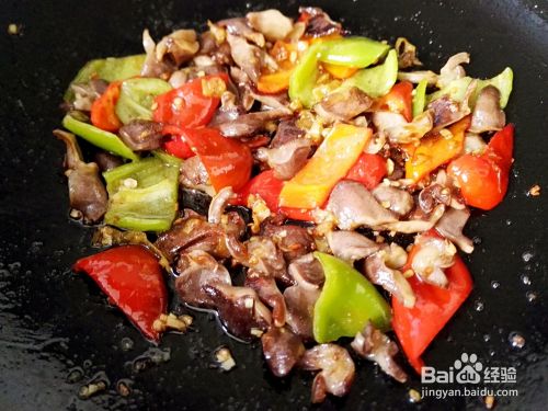 把青红辣椒放入鸡胗中一起翻炒,待辣椒炒到七八成熟的时候,加入盐、蚝油、料酒翻炒入味,关火。