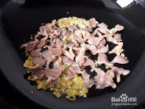 生姜和泡椒爆香了之后,再把鸡胗放进锅里,用大火翻炒几下。