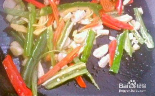 锅内留底油放入葱姜蒜炒香,放入青红椒翻炒