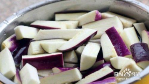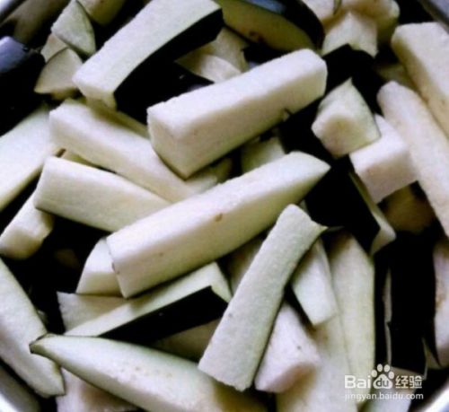 将茄子洗净切成长条状,接着接一盆清水,放入茄条浸泡十分钟,淋干水分备用