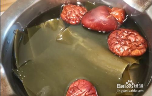昆布跟香菇先泡一公升水,约半小时。接着中火煮半小时,但不要煮滚,只要稍微起泡即可
