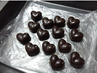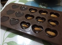 将巧克力液倒入模具,中间可添加各种配料,我放了杏仁。注意不要放太满,双手拉扯模具震荡平整。