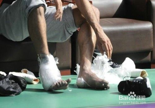 扭伤后首先把受伤脚放平,小心脱掉受伤脚的篮球鞋观察伤情。