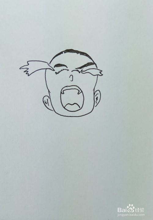 画出大头儿子的嘴巴部分和牙齿,他正在张大嘴巴哭泣呢。