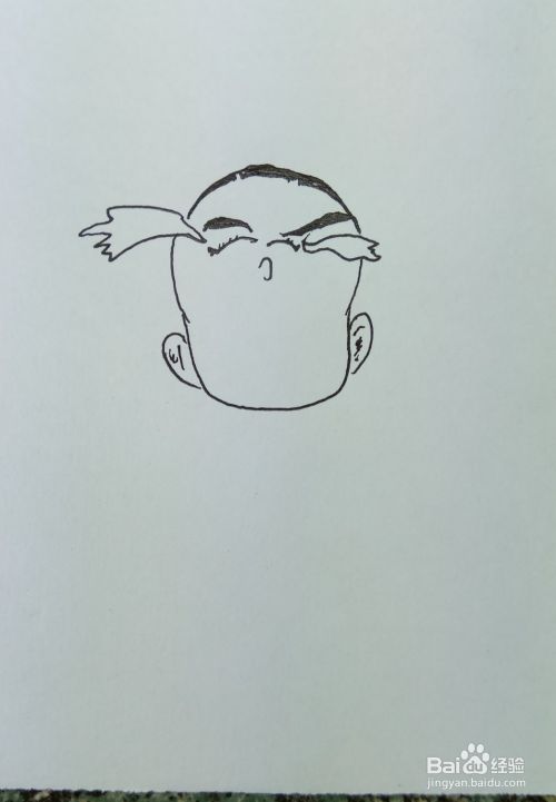 再用线条和曲线画出大头儿子的头部轮廓,并画出他的耳朵和头发。