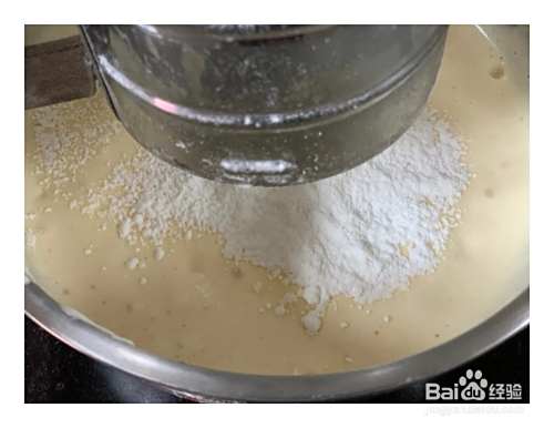 将低筋面粉过筛加入打发的蛋液中,翻拌均匀。
