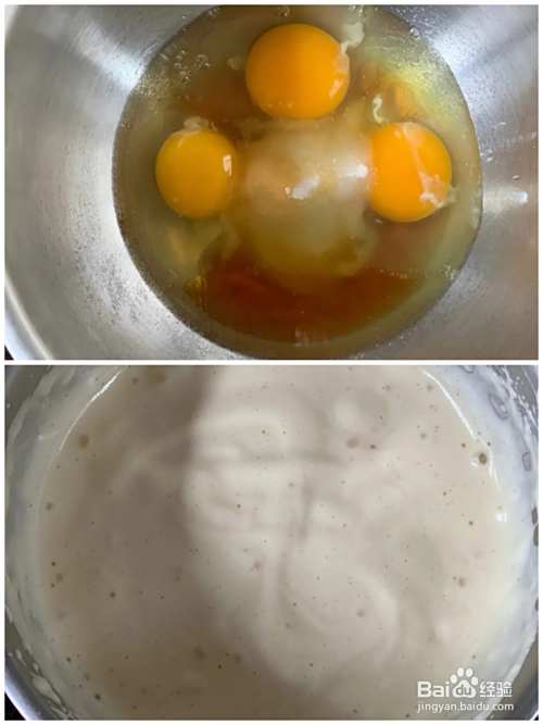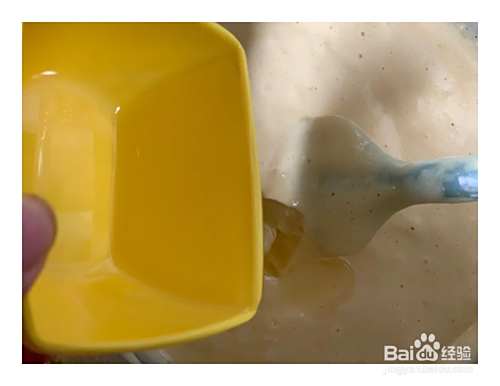 再加入玉米油,翻拌均匀,用勺子舀一下呈滴落状。