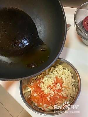锅里倒入食用油,加一把花椒,烧热油,把焯过水的豆腐丝 胡萝卜丝放入容器里,在豆腐丝上面撒上蒜沫,把热油浇上去。