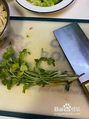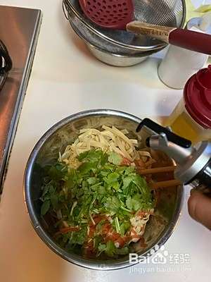 撒上香菜段,倒入生抽 香醋 盐 糖 鸡精,搅拌均匀。