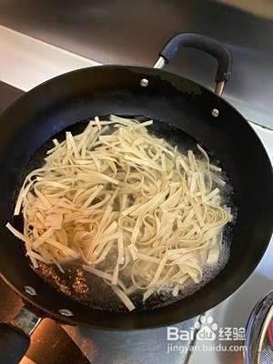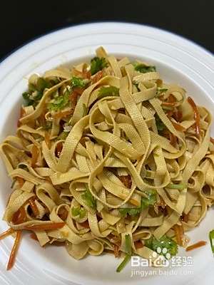 豆腐皮切丝,胡萝卜切丝,锅里水烧开,放入一小勺盐,下入豆腐丝焯水,捞出。