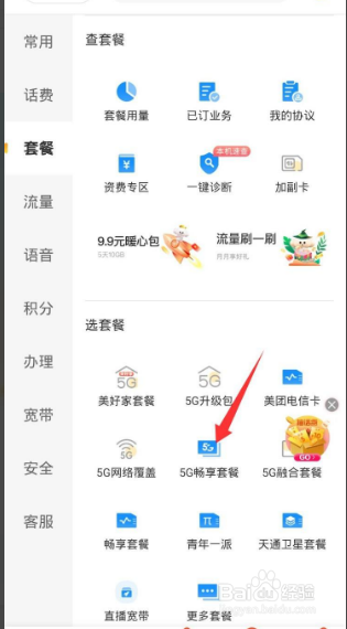 来到查询办理页面,点击套餐。