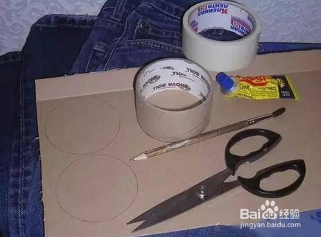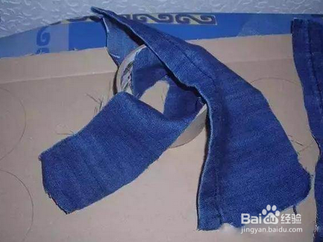 开始使用旧牛仔裤裁剪出包裹纸板的面料,按外圆和内圆的尺寸扩大1cm边距剪裁出,按纸板圆芯的高度再扩大2cm剪裁出2块矩形面料