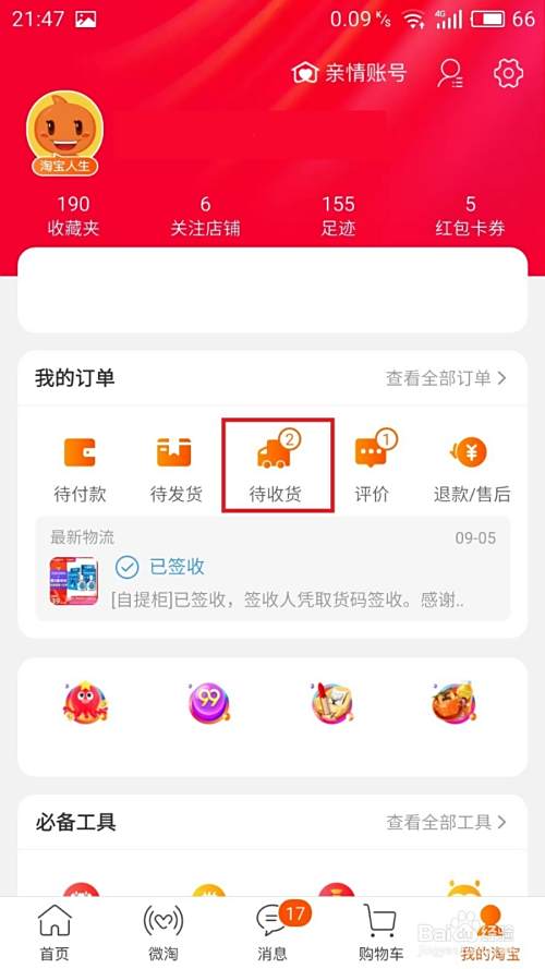 点击后,进入我的淘宝中,选择点击待收货选项。