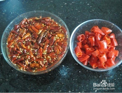 干辣椒和鲜辣椒洗净并剪段,干辣椒用清水浸泡~