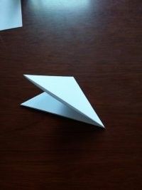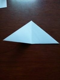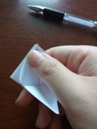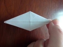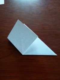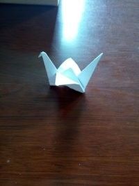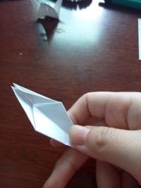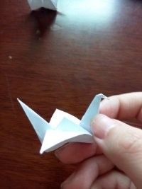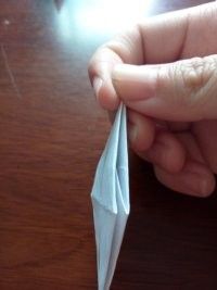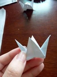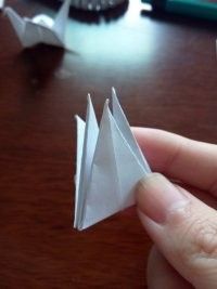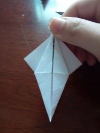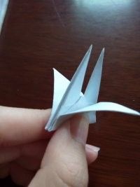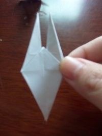 做好上面几步,再将夹在中间的尖角向外拉出来点,力道小点,最后,任选一边的尖角将其顶部向内折叠。这样美丽的纸鹤就出世了