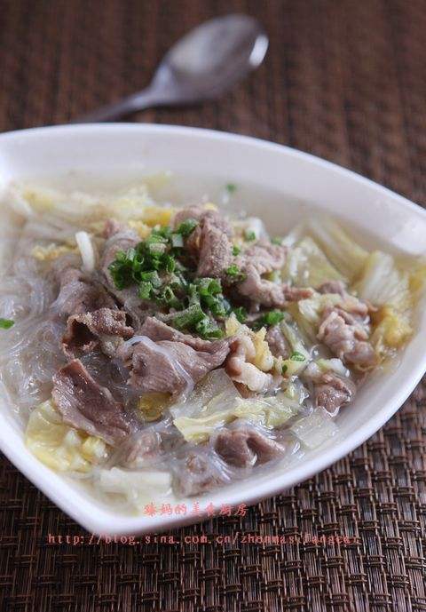 再次煮沸后,加入羊肉片,调入盐,鸡精,煮开后调入多一些的白胡椒粉及香油,洒上葱花即可。