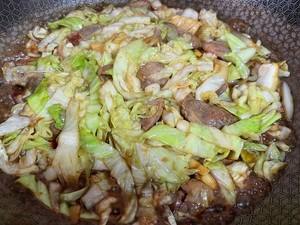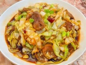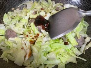香肠炒两分钟左右,下包心菜翻炒。加入一勺蚝油、一勺酱油、两滴老抽提味增鲜。