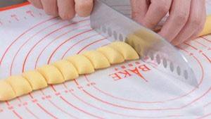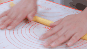 面团发酵完成后,去掉保鲜膜,将面团揉匀,整理成条状。