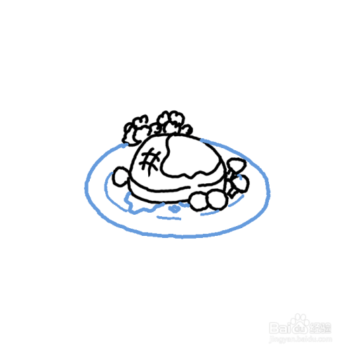 在牛排旁画出三个小圆圈,形成小番茄