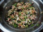 猪肉,鸡蛋,葱,虾干。猪肉剁碎,虾干泡开剁碎,葱切成葱花。加入油,淀粉,糖,酱油拌匀。