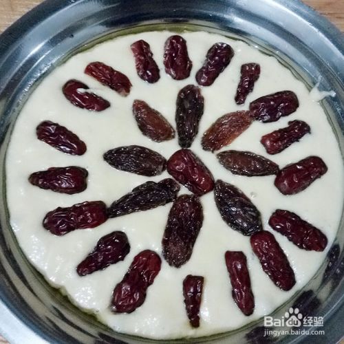 面糊发酵至原来一倍大时,盆中刷一层食用油,倒入面糊,上面放入大枣和葡萄干。