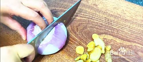 将姜切成姜片,再准备一颗洋葱一分为二给切开,切开之后用一半就可以了,直接将洋葱滚刀切块。切好的洋葱跟姜片全部放入盘中备用