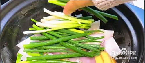 起锅烧油,油热之后放入洋葱姜片炒一炒,洋葱翻炒均匀之后,放入葱段,均匀铺在底部。