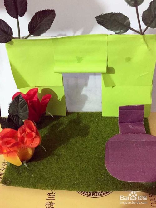 最后,用胶水把准备好的花和叶子粘在草坪上,现在,DIY的小阳台就完成啦。