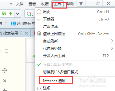点击右上方的工具选卡,然后点击internet选项。