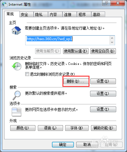 进入到internet属性,点击浏览器记录的“删除”。
