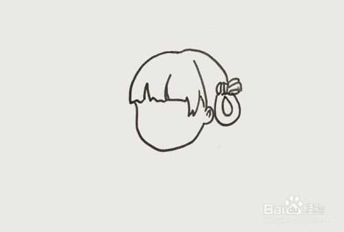 先画出层次分明的发型,画出一个平刘海,在头上画出蝴蝶结的发饰,往下画出古代女子的发型,往下画出略尖的脸。