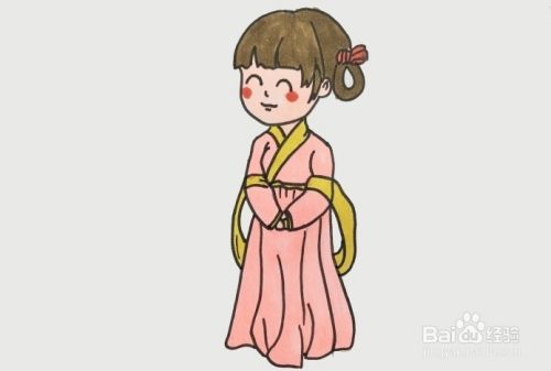 先画出古代女子平刘海的发型,往下画出脸部,接着画出衣襟、衣袖和腰带,往下画出裙摆,在手上画出披帛,把衣服涂上粉红色,领口和披巾涂上黄色,头发涂上褐色,简单的古代女子就画好了。