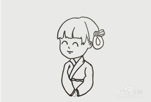 在脸上画出笑眯眯的眼睛、小巧的鼻子和嘴巴,往下画出衣襟,往下画出交叠在一起的衣袖,在手的附近画出腰带。