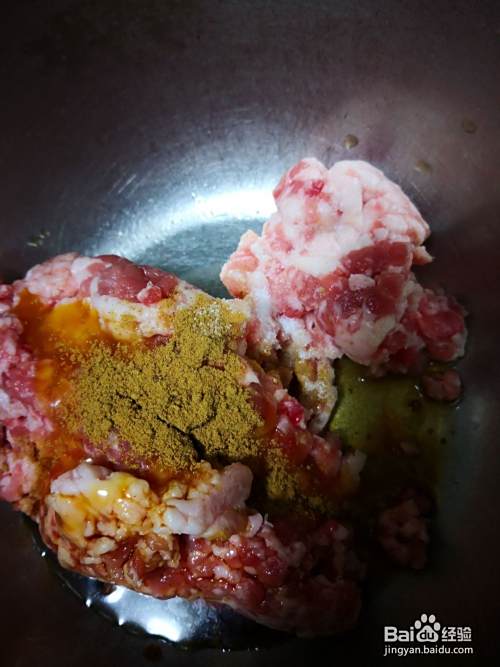 猪肉馅加入料酒,十三香,酱油耗油,盐搅拌均匀。