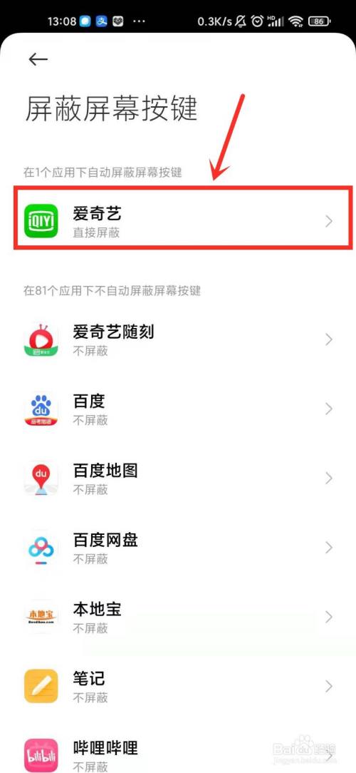 找到要解除屏蔽按键的应用,然后点击。