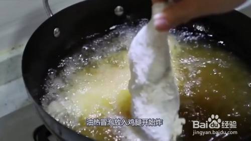 锅中加入适量的油,油尽量的多一些,油热冒泡放入鸡腿开始炸,中间要记得翻动下,这样颜色会更均匀,炸好的鸡腿捞出,重新再炸一遍鸡腿,炸不到1分钟就可以捞出来了。