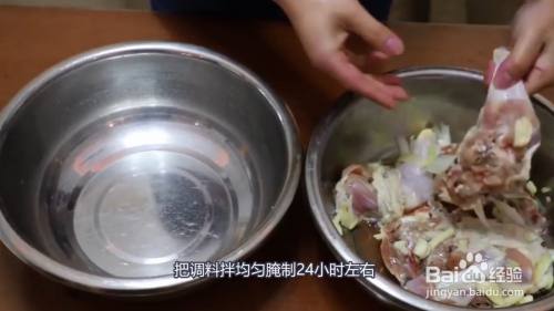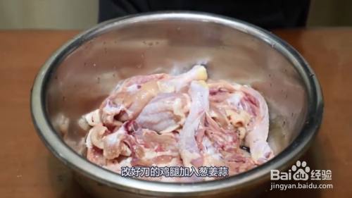 提前准备好一些鸡腿,把准备好的鸡腿改刀,改好刀的鸡腿加入葱姜蒜,再加入适量的盐和料酒去腥。