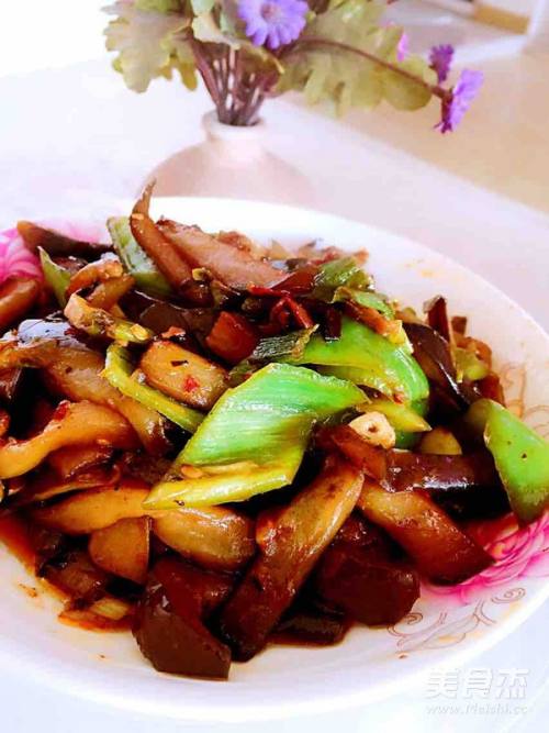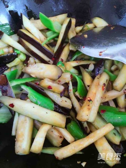 7将炒好的茄条以及切好的尖椒依次倒入锅中翻炒一会儿。
